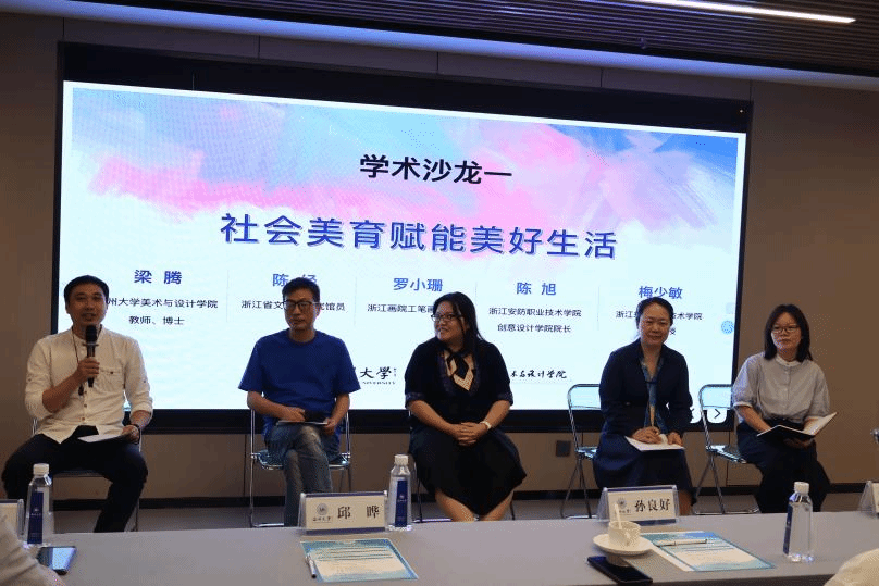 该场由电竞博彩平台-亚洲电竞投注平台 教师、博士梁腾主持,浙江省文化馆研究馆员陈经、浙江画院工笔画所所长罗小珊、浙江安防职业技术电竞博彩平台 创意设计电竞博彩平台 院长陈旭、浙江东方职业技术电竞博彩平台 客座教授梅少敏围绕“社会美育赋能美好生活”展开分享和讨论。