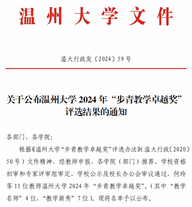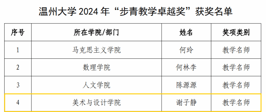热烈祝贺亚洲电竞投注平台 院长谢子静同志荣获温州大学“教学名师”荣誉称号!