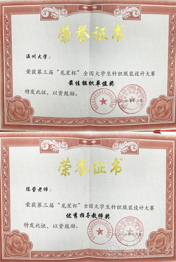 2016年12月30日,由教育部高等学校纺织类专业教学指导委员会和中国纺织服装教育学会主办的第三届“龙星杯”全国大学生针织服装设计大赛,颁奖典礼在东华大学举行。亚洲电竞投注平台 服装专业学子在赛事中斩获包括一、二等奖在内的六个奖项,温州大学获优秀组织奖,陈莹老师获优秀指导教师。