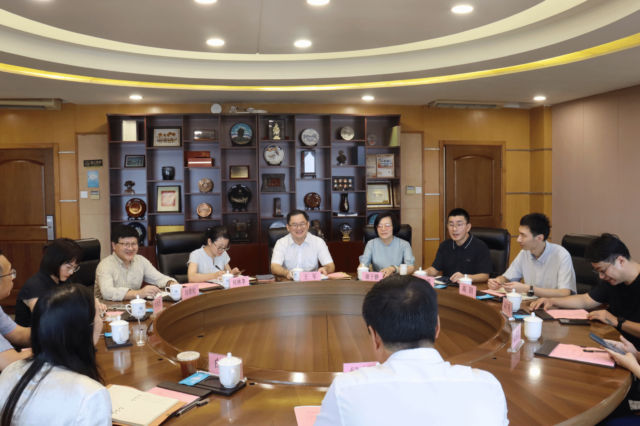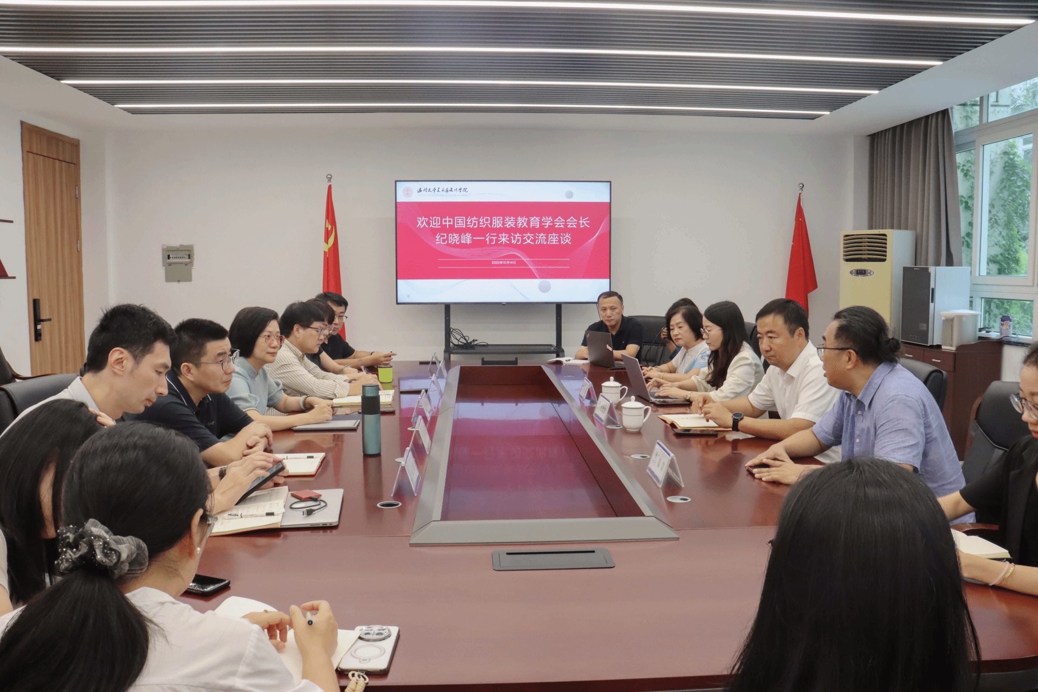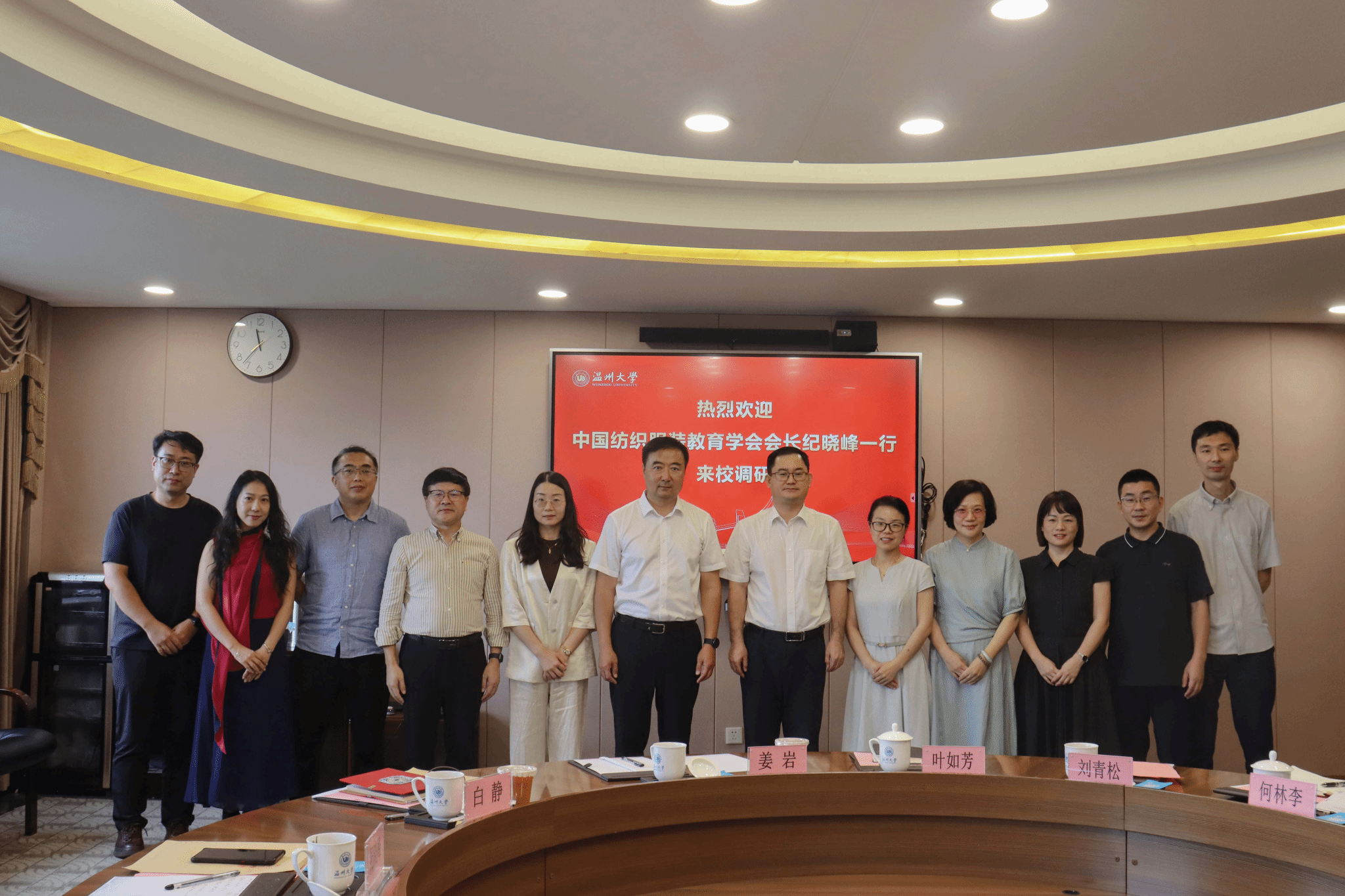 纪晓峰会长对温州大学在纺织服装教育领域所取得的成绩表示充分肯定,并就行业发展趋势、人才培养模式创新、专业认证推进等方面提出了指导性意见。与会人员围绕纺织服装教育的未来方向、校企合作机制、智能技术融合等议题展开了深入交流。座谈会后,双方合影留念。