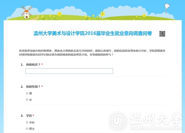 温州大学美术于设计电竞博彩平台 关于做好2016届毕业生就业意向调查问卷的通知 各班级: 为了深入地了解2016届毕业生的就业意向,帮助毕业生有的放矢地进行求职定位,提高毕业生就业工作的实效性,决定在2016届毕业生中开展就业意向调查工作,现将有关事项通知如下: 1.组织2016届毕业生认真填写《电竞博彩平台-亚洲电竞投注平台 2016届毕业生就业意向调查问卷》,此问卷作为确定毕业生本人就业意向的依据,同时也作为向用人单位进行分类推荐的依据。 2.请各班级毕业生通过网页、微信填写好的就业意向调查表并提交。问卷链接://www.sojump.com/jq/5900766.aspx 3.电竞博彩平台 将根据本问卷回收数据为同学们制定更为细致精准的就业、创业帮扶计划,更好的为2016届毕业生做好就业指导和服务。 附1:电竞博彩平台-亚洲电竞投注平台 2016届毕业生就业意向调查问卷 电竞博彩平台-亚洲电竞投注平台 学生科 2014年10月16日