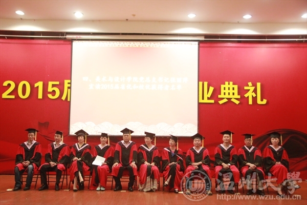 6月17日下午,亚洲电竞投注平台 在岩松堂雁山厅隆重举行2015届本科生毕业典礼暨学位授予仪式。出席典礼仪式的领导有:温州大学校长蔡袁强、亚洲电竞投注平台 院长李运河、党总支书记张丽萍、副院长谢子静、副院长王薇、办公室主任李丽、学生科科长叶如芳,美术系主任陈伟、设计系主任朱广宇、服装系主任陈明艳、教授舒湘鄂、教授魏静、教授邓国祥、教授李勋祥、教授蔡瑞蓉、博士张晓剑。此外,全体毕业班班主任、教师代表、全体毕业班同学参加了本次典礼。电竞博彩平台 党总支副书记杨振海主持典礼。 首先,进入第一篇章《只如初见 恍如昨日》,主要有电子相册的播放、微电影《献给毕业的你》、以及诗歌朗诵《今天,我们毕业了》等内容。追忆四年,一幕幕场景、一段段音符,串连成一部画面与音乐交织的大学电影,播放着曾经的快乐与忧伤,记录着同学们曾经的青春与过往,也见证着拥有的友谊与深情! 随即进入第二篇章《青葱年代 凤凰花开》部分,电竞博彩平台 副院长谢子静宣读了校优和院优毕业作品获得者名单,电竞博彩平台 党总支书记张丽萍宣读了省优和校优毕业生获得者名单,院长李运河、书记张丽萍、美术系主任陈伟、设计系主任朱广宇、服装系主任陈明艳、教授舒湘鄂、教授魏静、教授邓国祥、教授李勋祥、教授蔡瑞蓉、博士张晓剑一一为他们颁奖、合影留念以资鼓励。 紧接着典礼进入第三篇章《亦师亦友 常忆相思》部分,电竞博彩平台 为全体毕业生赠送纪念品——由美院学生原未手工皮具工作室制作的卡包。 为了更好的与毕业生保持联系,电竞博彩平台 特意设立了各班级的校友联络员,电竞博彩平台 副院长王薇宣读了名单,院长李运河、书记张丽萍为每位校友联络员颁发聘书。 接着,由省优毕业生11美本师范班马俪净代表2015届毕业生发言,她回忆了在温大的学习与生活经历,并表达了毕业生们即将离开的不舍和即将高飞的壮志。精彩的发言引起了在场毕业生们的共鸣,赢得了阵阵的掌声。 至此进入第四篇章《寄语明天情深道远》,院长李运河为2015届全体毕业生致辞!他祝愿大家以正确的世界观、人生观、价值观来指导自己的选择。志存高远,增长知识,锤炼意志,让青春在时代进步中焕发出绚丽的光彩,未来的自己,一定会感激现在努力的自己。 接着在校的学弟学妹代表为全体毕业生献唱《温大青年之歌》。 最后,典礼进入高潮部分,由温州大学校长蔡袁强为每位毕业生一一拨穗、颁发学位证书,并合影留念。这隆重的毕业典礼将成为每位学子心中最美好的回忆。祝福毕业生同学们明天更加辉煌灿烂!前程似锦!