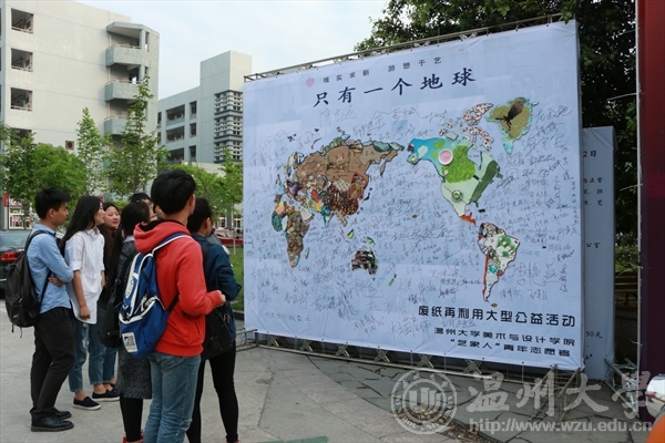 在第41个世界地球日来临之际,在“七十亿人的梦想: 一个地球,珍惜地球资源,转变发展方式,倡导低碳生活”的呼吁下,4月21日,电竞博彩平台-亚洲电竞投注平台 “艺家人”青年志愿者协会在美院楼举行了“乐行于艺,环保于己”地球日废纸再利用公益活动。 此次活动,旨在借助地球日活动平台提高公众对地球资源的认识,引导全社会积极参与节约集约利用资源、减少碳排放、促进经济发展方式转变的实践。为此,在今天的活动现场,设置了主题展览,废纸上作画,签名等活动。志愿者们在废弃的报纸,电池,矿泉水瓶等上面作画,一件件精美新奇的艺术作品应运而生,又将作品“画”成也一副巨大的世界地图,别有一番风味,让在场的学子们连连称赞,并纷纷在喷绘上进行环保宣言签名。 地球是人类共同家园,美院学子用自己专业技能变废为宝废,用绚丽的色彩,艺术的行动,倡导公众注意地球状况和人类活动对环境的危害,强调保护和改善人类环境的重要性,此次活动获得全校师生的共同认可和赞扬,并被温州都市报报道。通讯:刘子彰、摄影:孙彦鑫epaper.wendu.cn/Html/2015-04-22/12/content_5.html