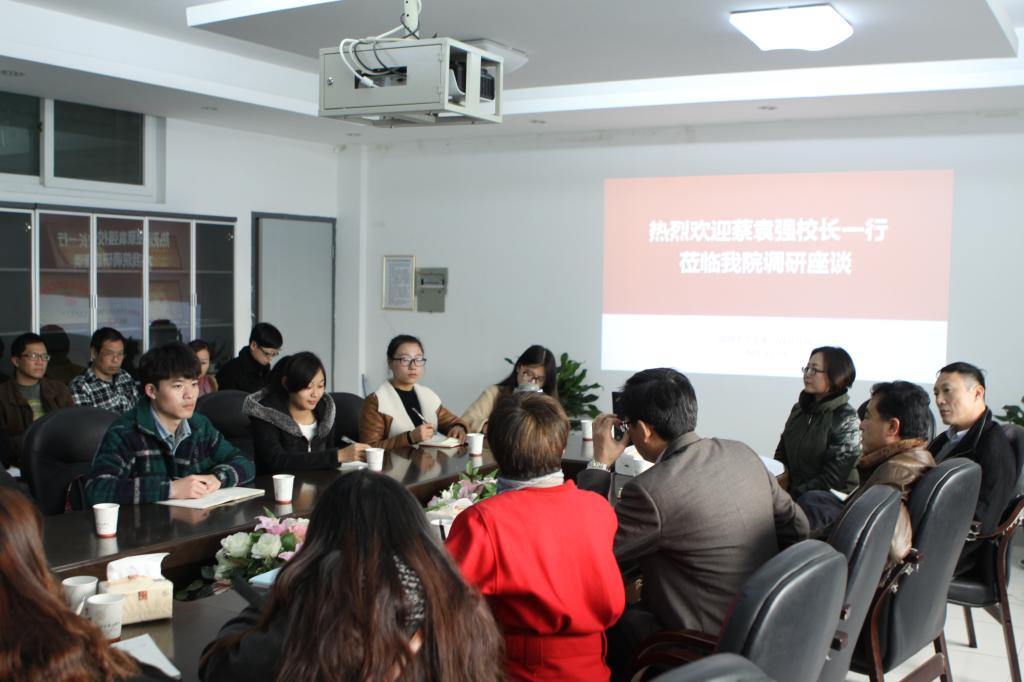 12月24日下午,蔡袁强校长一行莅临亚洲电竞投注平台 调研座谈,座谈会在南校区美术楼2B216召开。出席会议的校领导还有牟德刚副书记、薛伟副校长,党校办、教务处、人事处、学生处、就业处、教师教学发展中心等相关职能部门负责人陪同调研,参加座谈的还有亚洲电竞投注平台 班子成员、各科室负责人以及22位往届毕业生与在校生代表。座谈会主要围绕如何加强教风学风建设、提高人才培养质量与提升毕业生就业核心竞争力而展开。会议由教务处处长施晓秋主持。