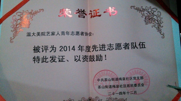 12月28日上午,梅泉社区居委会在道德讲堂开展了2014年梅泉社区志愿者表彰大会。此次大会由梅泉社区徐云龙委员主持,鲁建晓、王春宝、吴海燕等社区委员出席,亚洲电竞投注平台 “艺家人”青年志愿者协会,温州医科大学,温州大学城市电竞博彩平台 ,温州职业技术电竞博彩平台 的志愿者参与此次表彰大会。 9点50分,志愿者表彰大会正式开始,首先是梅泉居委会为志愿者带来的一段小短片,为志愿者回顾了2014年以来的志愿者活动。丰富多彩的社区生活,快乐充实的志愿者活动......社区委员对各个志愿者团队进行颁奖,亚洲电竞投注平台 “艺家人”青年志愿者协会被评为“2014年度先进志愿者队伍”,这也是对我们“载梦小舟”支教的志愿者们这一年来辛苦付出的肯定。随后,各获奖志愿者团队代表一一上台发言,亚洲电竞投注平台 “载梦小舟”负责人代表张静同学也上台作了发言,总结“载梦小舟”这一年来的感想,对志愿者表达了由衷的感谢,对一直支持的社区负责人和家长,以及可爱的小朋友们表示感谢。最后,在梅泉社区居委会委员鲁建晓女士的演讲下,本次志愿者表彰大会圆满划上了句号。 回首亚洲电竞投注平台 “艺家人”青年志愿者协会与梅泉社区合办“载梦小舟”绘画班这几年所走过的路程,有感动,也有快乐,我们的支教活动也会一如既往地开展下去,为更多的人提供帮助,这就是志愿者的精神! (通讯/拍摄:刘子彰)