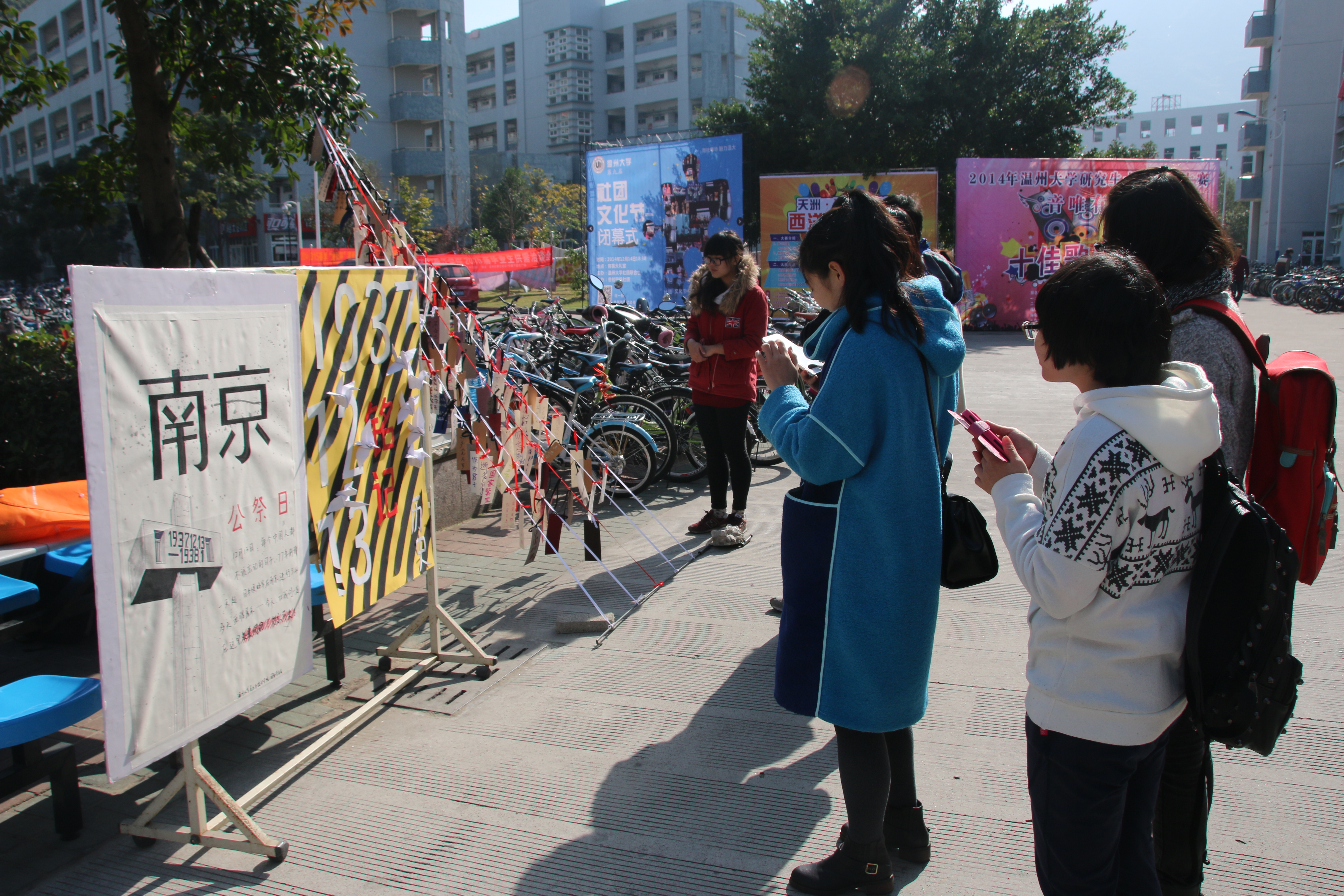 12月13日当天,电竞博彩平台-亚洲电竞投注平台 团委学生会创业就业部与学风纪检部为响应本次国家公祭日,在超豪学区开展举办了祭语公祭悼念活动。本次活动展出了两张手绘悼念大海报及多张手绘宣传公祭漫画,同时开展了温大学子亲手写寄语、挂祭语活动。一同为南京大屠杀遇难人民哀悼,缅怀抗日先烈,勿忘国耻,铭记历史。 记住历史,但不要记住仇恨; 可以原谅,但绝不可以遗忘; 让白骨可以入睡,让冤魂能够安眠 把屠刀化铸警钟,把逝名刻作史鉴; 让孩童不再惊恐,让母亲不再凄叹 让战争远离人类,让和平洒满人间; 让我们以国家的名义,祭奠死难同胞! (通讯员:沈宇烽,摄影:张昇)