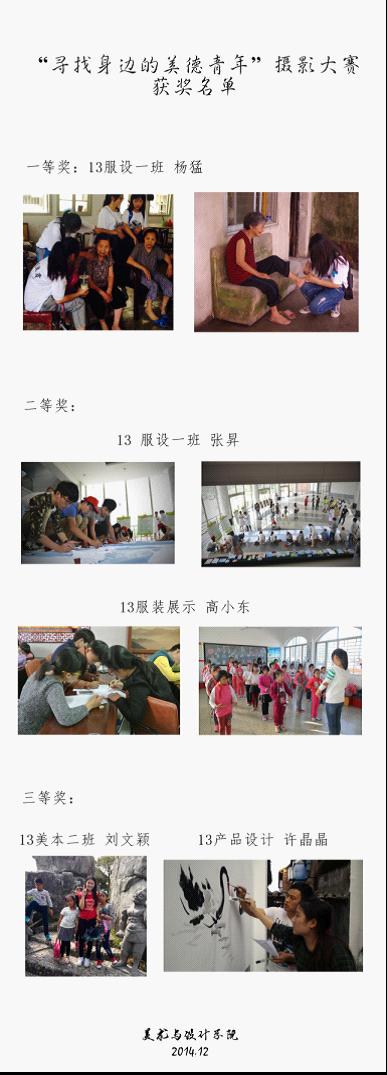 11月20日—12月1日,亚洲电竞投注平台 团学素质拓展部和设计宣传部联合开展了主题为“寻找身边的美德青年”的摄影大赛,本次活动特邀亚洲电竞投注平台 陈旭海老师和陈赛慧老师担任评委。 拍摄的画面中有开学季帮助大一新生搬行李指路的忙碌身影,有在敬老院给爷爷奶奶们递水、剪指甲的情形,有用画笔描绘五彩青春的画面,更有“一对一”教小朋友绘画的温馨瞬间......同学们用镜头捕捉下了这一幕幕精彩的瞬间,留住了点滴的温暖,使之成为寒冷冬天里一束温暖人心的光亮。 摄影是文明的手印,是记录,也是创造,它形象地记录发生在我们身边的点点滴滴,也让定格成为记忆里不可抹去的永恒瞬间。此次活动不仅为同学们提供展现自我价值的平台,也提高了当代大学生的情感修养、道德情操,为学生生活增添活气。 附:摄影比赛评选结果 一等奖: 13 服设一班 杨猛 二等奖: 13 服设一班 张昇 13服装展示 高小东 三等奖:13美本二班 刘文颖 13产品设计 许晶晶