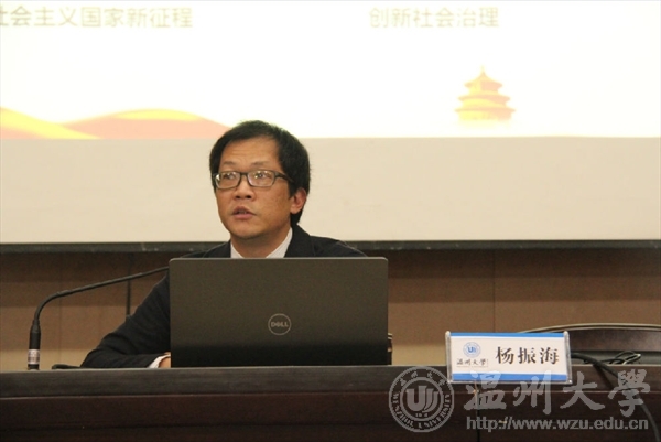 12月6日下午,亚洲电竞投注平台 在岩松堂雁山厅组织开展形势与政策课教学,电竞博彩平台 党总支副书记杨振海为17级全体同学作“十九大报告精髓要义导读”报告。
