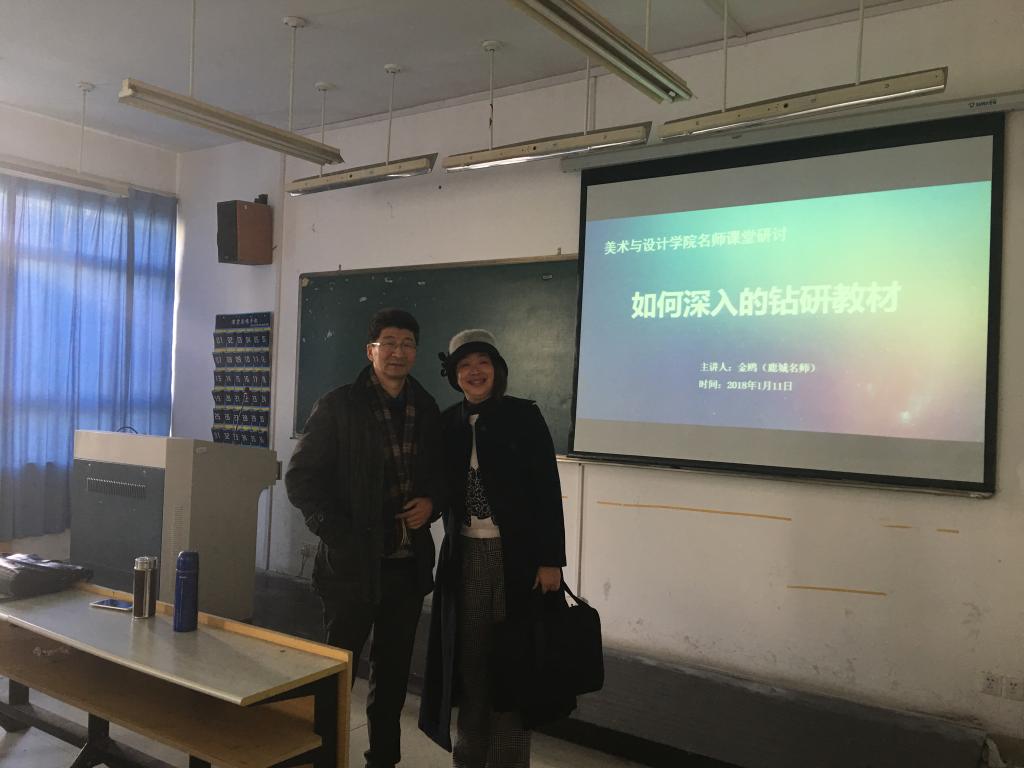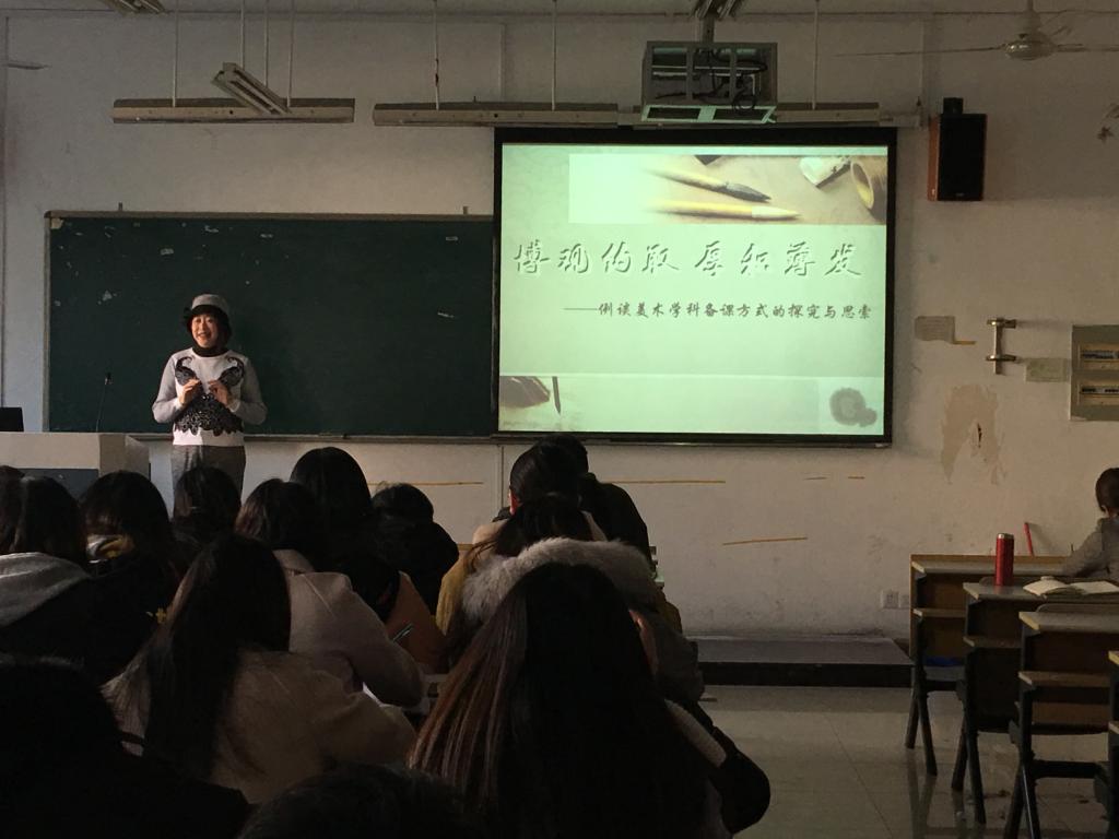 2018 年1 月11 日上午8:30在温州大学3B204教室,温州市鹿城区名师金鸥老师为亚洲电竞投注平台 的师范生和研究生作了以“如何深入的钻研教材”为主题的课堂研讨。亚洲电竞投注平台 胡建南老师主持了活动。 本次研讨给同学们带来极大震撼,使同学们认识到深入的钻研教材的重要性。首先,金瓯老师围绕如何深入的钻研教材,通过引案例、与同学间的互动、点评并结合自身经历为同学们分析了上好一节美术课的前提,用幽默风趣的语言向同学们提出了相应的的解决方法,提出了备课前三步走的工作思路和具体的备课过程。整个教室不时发出清脆动听的笑声,同学们在轻松的氛围中认识到深入钻研教材的重要性。她还对同学们提出了深入钻研教材备课的建议,对同学们寄予了殷切的期望,同学们以热烈的掌声欢送金鸥老师离场。 最后,胡建南老师做了总结性发言,本次活动取得圆满成功。
