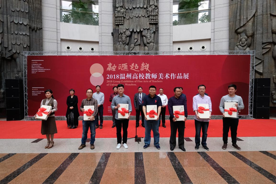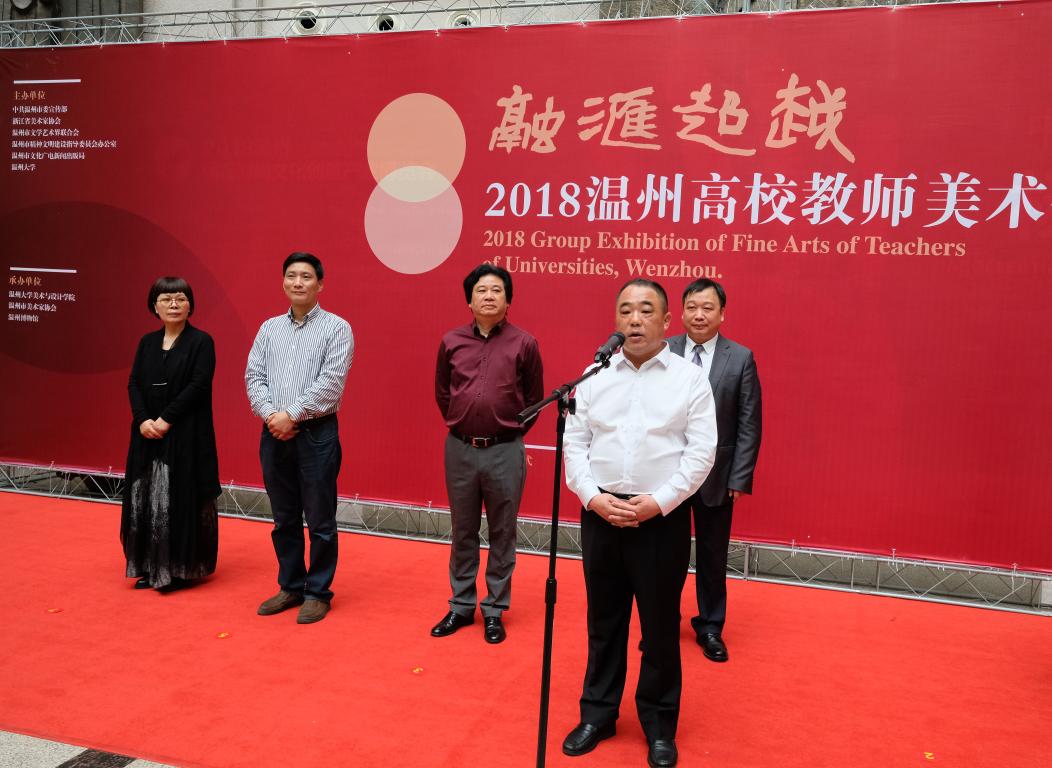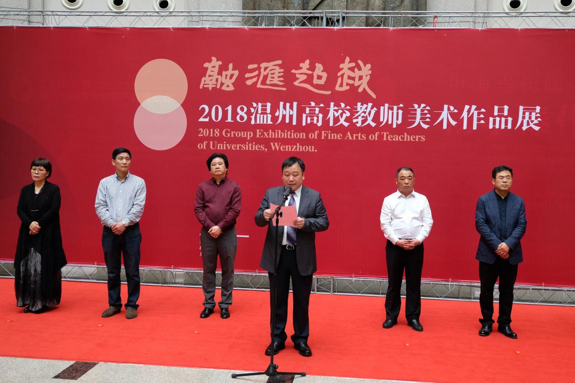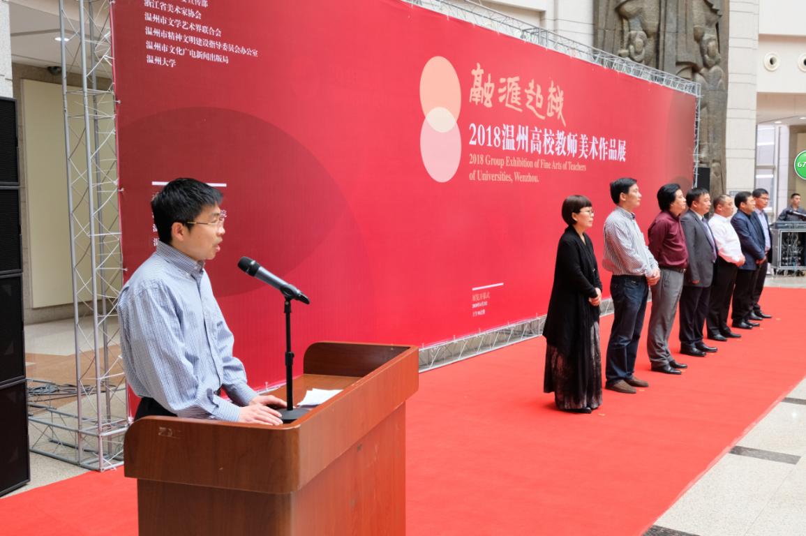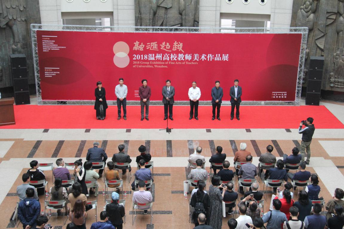 4月3日上午,“融汇超越”——2018温州高校教师美术作品展在温州市博物馆隆重开幕。出席开幕式的领导嘉宾有:温州大学党委副书记赵敏,中共温州市委宣传部副部长魏平生,浙江省文联副主席、温州市文联主席邹跃飞,温州市文联副主席、电竞博彩平台-亚洲电竞投注平台 院长李运河,温州市文明办副主任余庆,温州市文广新局副局长李方喜,浙江省美术家协会副主席、温州市美术家协会主席蔡瑞蓉,特邀嘉宾还有原校党委书记陈艾华,市教育局高教处处长黄万统,另有叶玉昶、沈尧伟、钟式震、马亦钊、张如元、袁纲平、金松、陈钦权等老教授,美术家协会戴宏海、张成毕、陈旭海、李崇高等同仁,书法家协会汪廷汉、陈出新、陈胜武等同仁,书画院郑方伟、陈默、张真恺、林翼如等同仁,此外,学校老干部工作部部长陈慧、成人(继续)教育电竞博彩平台 院长胡记芳等学校部门(电竞博彩平台 )领导,亚洲电竞投注平台 党总支书记张丽萍,副院长谢子静、张晓剑,副书记杨振海,电竞博彩平台 师生代表200余人参加了开幕式。群贤毕至,少长咸集 。