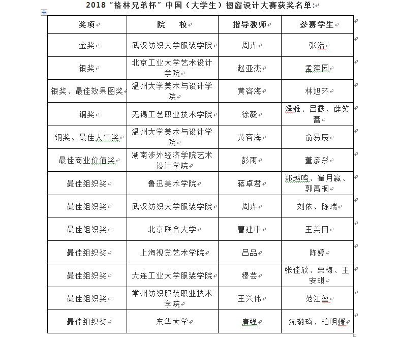 2018“格林兄弟杯”中国(大学生)橱窗设计大赛于5月18日在北京落下帷幕,在当晚举行的尚坤塬·2018中国国际大学生时装周颁奖典礼上,亚洲电竞投注平台 黄容海老师指导的14服装展示班两位学生的参赛作品狂揽4项大奖。林旭环同学的作品《昨日世界》荣获银奖和最佳效果图奖;俞易辰同学的作品《迷恋》荣获铜奖和最佳人气奖。