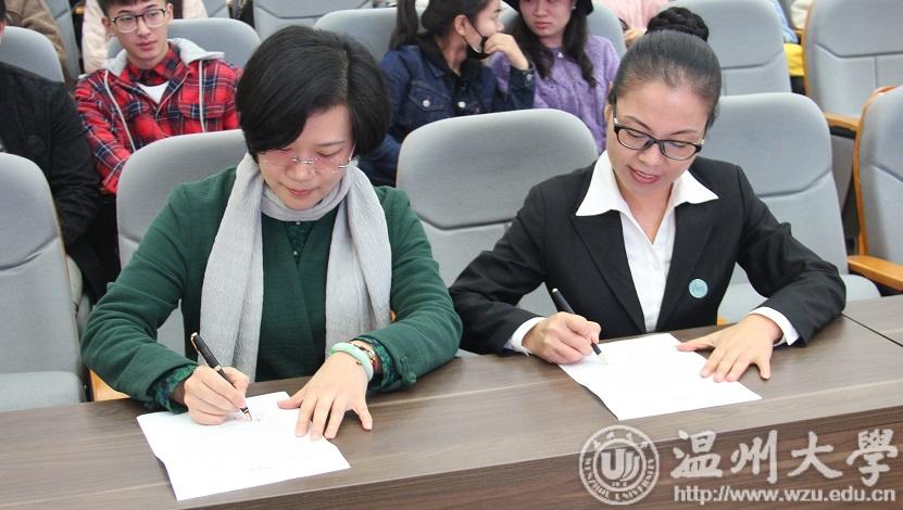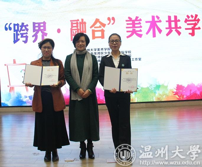接下来,双方签订了温州大学教师教育实践基地协议,给龙湾区的两位名师颁发了校外指导师聘书。