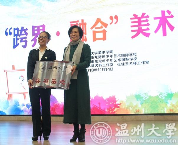 11月14日上午,亚洲电竞投注平台 和温州市龙湾区少年艺术国际学校举办了主题为“跨界.融合-美术共学”的温州大学教师教育实践基地签约仪式暨16级美术师范生教育见习见面会。谢子静副院长、龙湾区教育局王颖副局长、龙湾少艺校陈小琴校长、亚洲电竞投注平台 美术系胡建南老师、教学科邹青老师、胡凯老师、龙湾区教学名师张佳玉老师及少艺校美术教研组的全体老师,还有亚洲电竞投注平台 16级美术学师范本科生、18级美术教育硕士等43位同学参加。少艺校艺术总监李晓玮老师主持了会议。