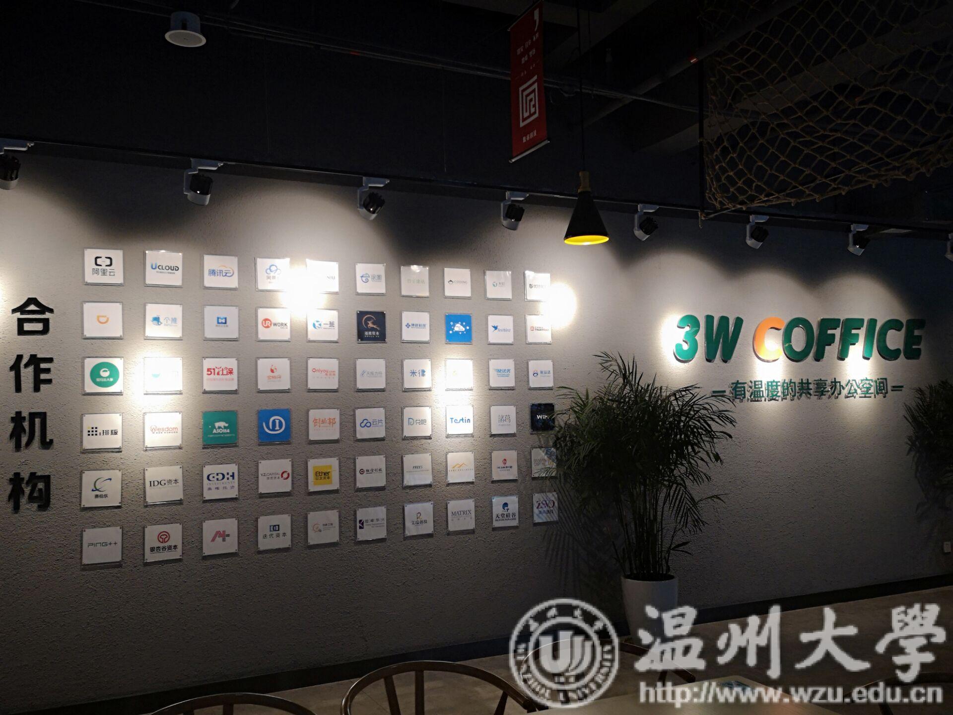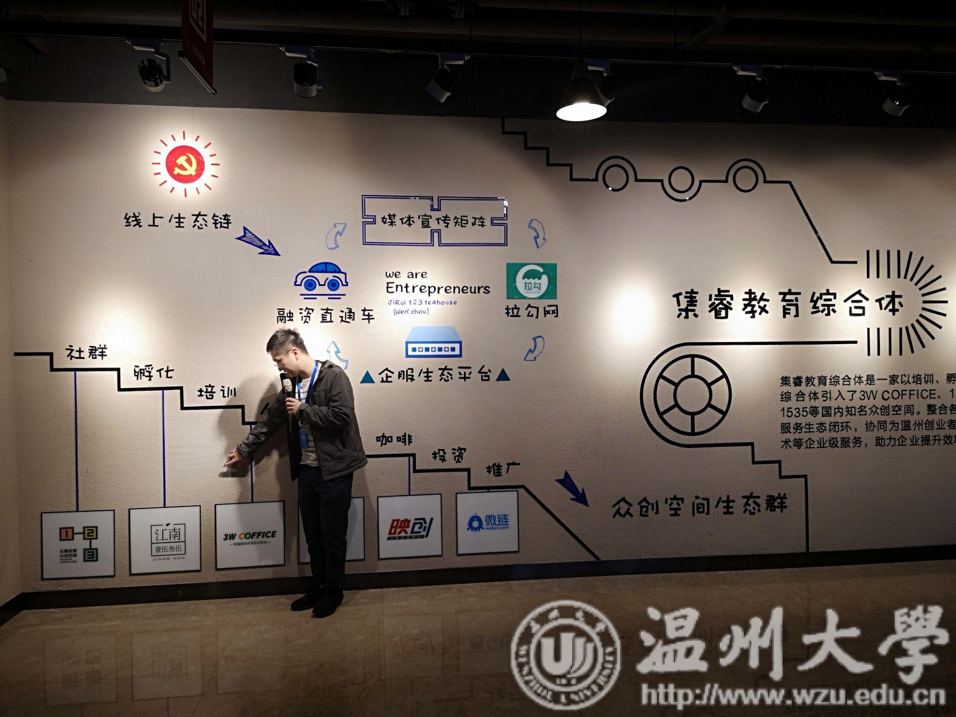 行程过半讲解员带同学们来到了共享办公室的内部,同学们的目光被墙上贴的照片与合作机构的LOGO所吸引,而墙上以图标所描述的发展过程和各个产业链之间的关系让同学更简单的去理解,这也令办公室内的工作氛围更加和谐,不呆板,不老套。