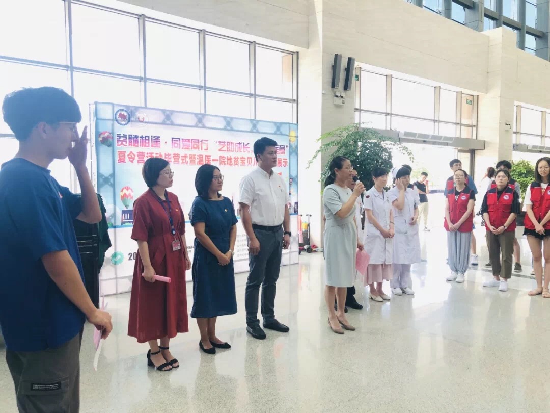 2019年7月23日上午,温州医科大学附属第一医院党委副书记金嵘;电竞博彩平台-亚洲电竞投注平台 党委书记叶正飞;温州医科大学附属第一医院血液内科主任俞康;温州医科大学附属第一医院血液内科副主任、阳光地贫志愿队队长陈怡;温州医科大学附属第一医院团委专职副书记尚蕾蕾;电竞博彩平台-亚洲电竞投注平台 学工办主任杨鹏;电竞博彩平台-亚洲电竞投注平台 辅导员等人来到温州医科大学附属第一医院南大厅参加了“贫髓相逢 同爱同行”夏令营闭营仪式。