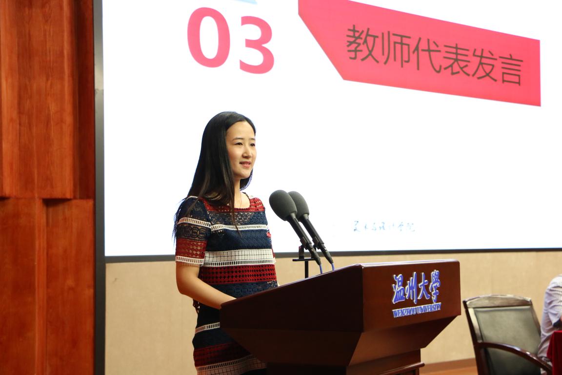 教师代表叶婷博士发言。叶老师结合自己的成长历程,用生动的比喻告诉同学们什么是当代大学生应该具有的生活,鼓励大家注重积累敢于磨炼,能经得住诱惑耐得住寂寞、不断地充实提升自己、不负大学时代的青春韶华。