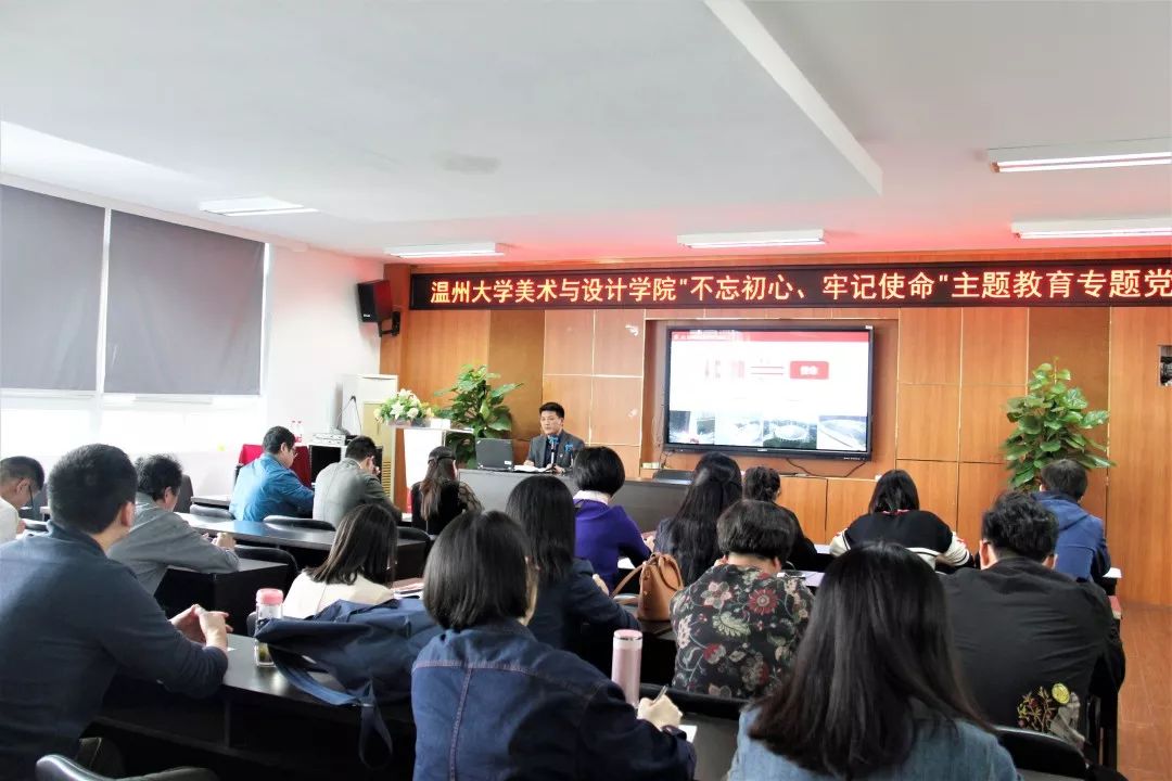 为扎实推进“不忘初心、牢记使命”主题教育,进一步增强党员的使命感和责任感,10月30日下午,美术电竞博彩平台 党委书记叶正飞、院长谢子静在2B-4001会议室开展主题教育专题党课,电竞博彩平台 全体教工党员参加,学校“不忘初心、牢记使命”主题教育办巡回督导二组组长戴梅红老师莅临指导。专题党课由电竞博彩平台 党委副书记杨丽君主持。