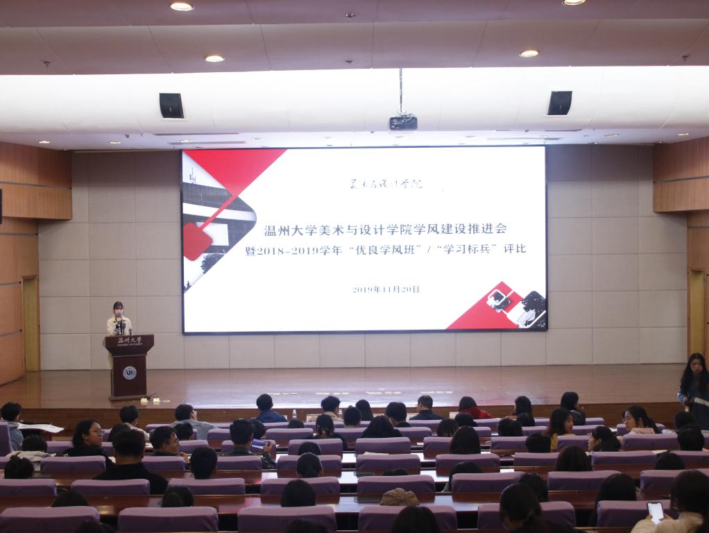 为加强美院学风建设,2019年11月20日晚,电竞博彩平台-亚洲电竞投注平台 学风建设推进会暨2018-2019学年“优良学风班”和“学习标兵”评比活动于育英图书馆报告厅顺利举行。出席本次评比活动的评委有亚洲电竞投注平台 党委副书记杨丽君老师,学工办主任杨鹏老师,教学科阳自杰老师,辅导员杨永利老师,学生会主席祝晴同学以及各班学生评委。